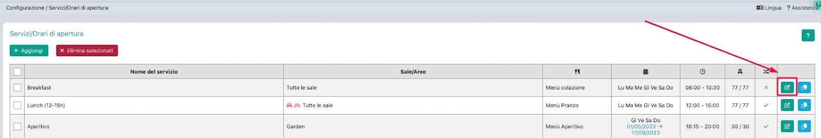 Accedi alla sezione Configurazione > Servizi e orari e creane uno nuovo oppure clicca sulla matita in corrispondenza del servizio che vuoi modificare: