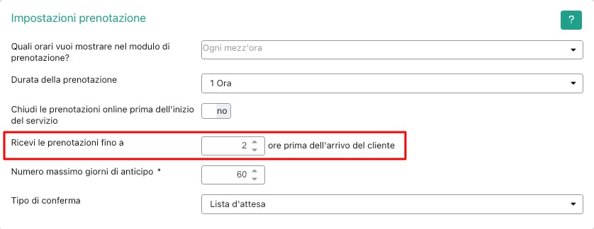 Esempio: se il tuo servizio inizia alle ore 12.00 e vuoi ricevere le prenotazioni non più tardi delle 10, dovrai inserire il valore 2, per dire al sistema che si possono effettuare prenotazioni entro le due ore precedenti e non oltre.