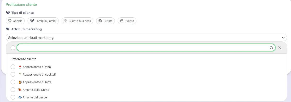Seleziona la tipologia di cliente e eventuali altre informazioni che ti possono essere utili per capire cosa gli piace e per cosa contattarlo: