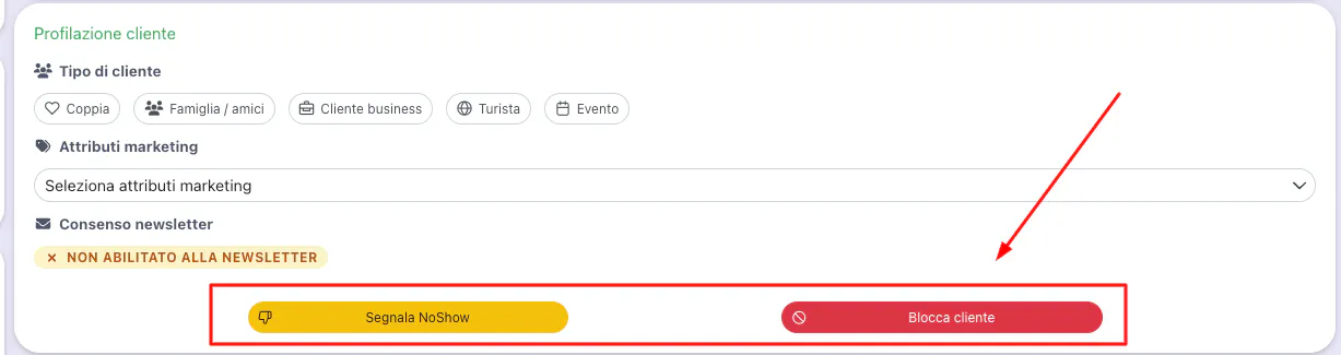 Dalla sezione Profilazione cliente, clicca il tasto rosso per bloccare e quello giallo per segnalare il no show.