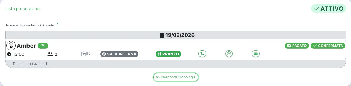 Nel dettaglio trovi: il giorno e l'orario delle prenotazioni, l'orario di arrivo del cliente, il canale di prenotazione, lo stato della prenotazione, sala e tavolo associato e modalità di prenotazione (Delivery, Asporto/Pay&Go).