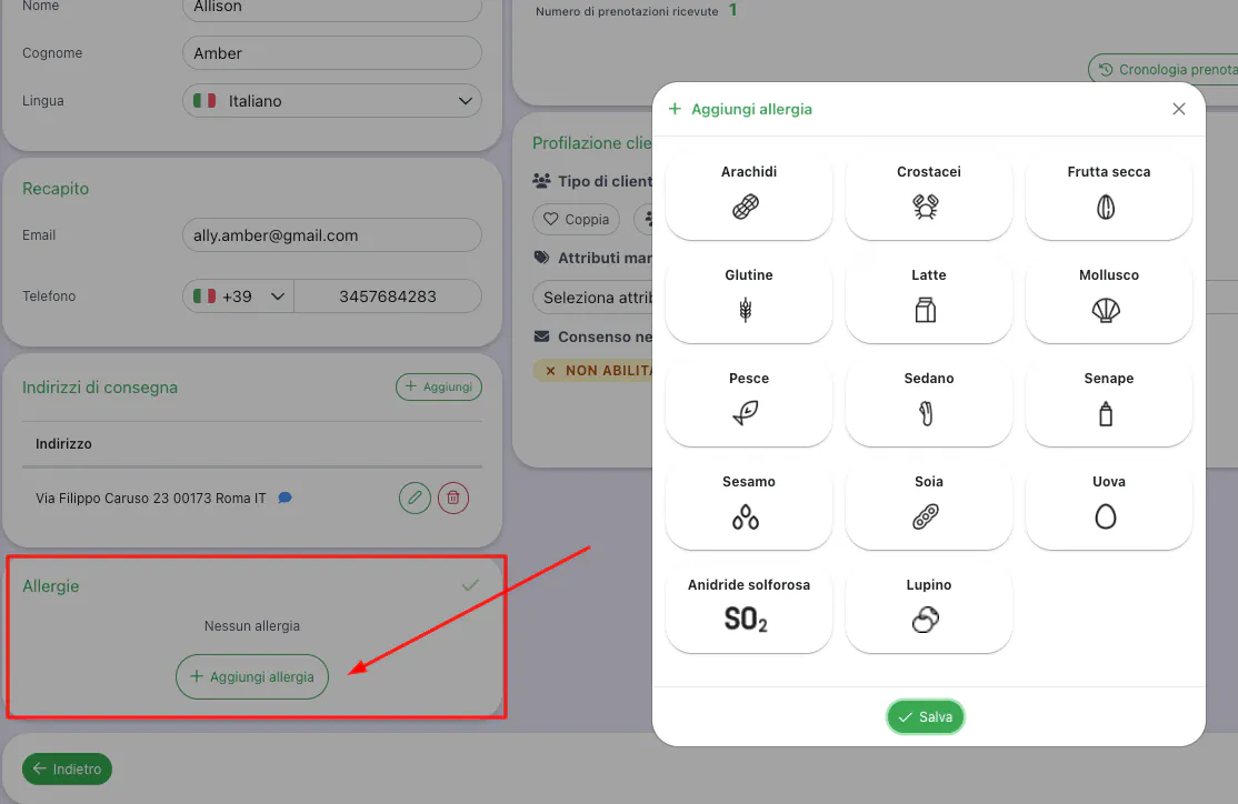 All'interno del profilo del cliente o dal dettaglio di prenotazione puoi indicare quali sono gli allergeni a cui è allergico/a, potrai salvarli e vederli in Dashboard quando il cliente farà una nuova prenotazione.
