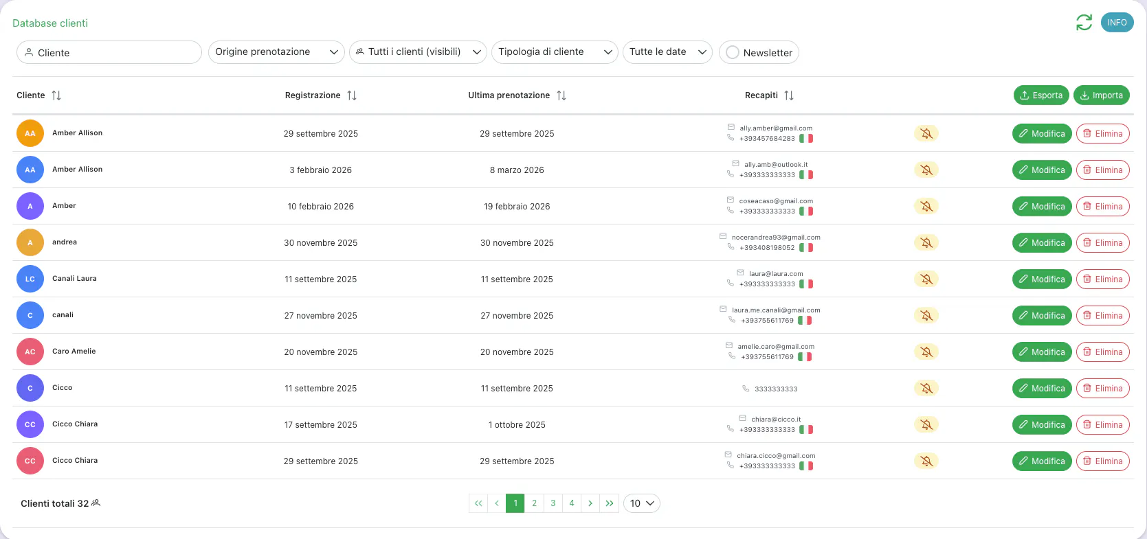 Accedendo al database dei tuoi clienti puoi trovare tutti i dati dei tuoi clienti. Utilizza i filtri di ricerca, puoi trovare il cliente con il nome, la mail, il numero di telefono oppure in base alla data.