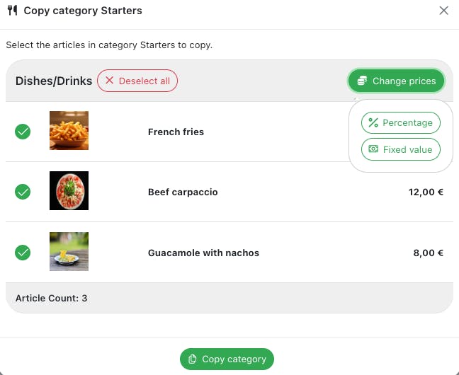 Choose the display order of the categories in the digital menu. By clicking the button, you can move categories up or down, which will allow you to set the order.Copy