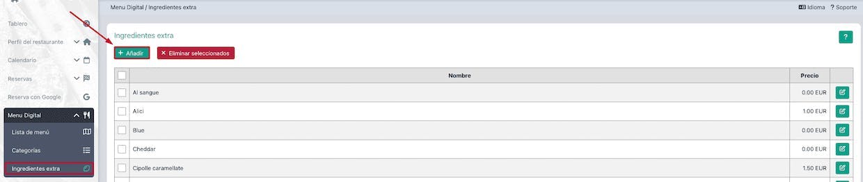 Puedes dar a tus clientes la posibilidad de añadir ingredientes extra, dale en Menù Digital > Ingredientes extra y dale a añadir..