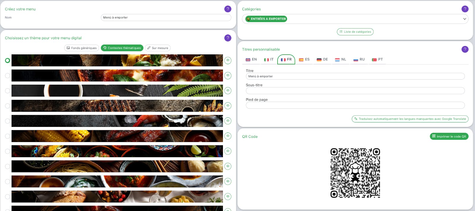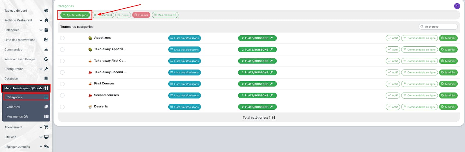 Accédez à la section Menu Numérique (QR code) > Catégories et en cliquant sur + Ajouter catégorie créez les catégories spécifiques pour l'à emporter.