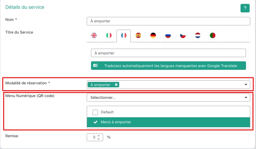 Entrez dans la page de modification du service "à emporter" que vous avez créé