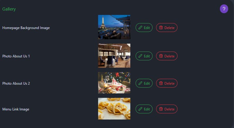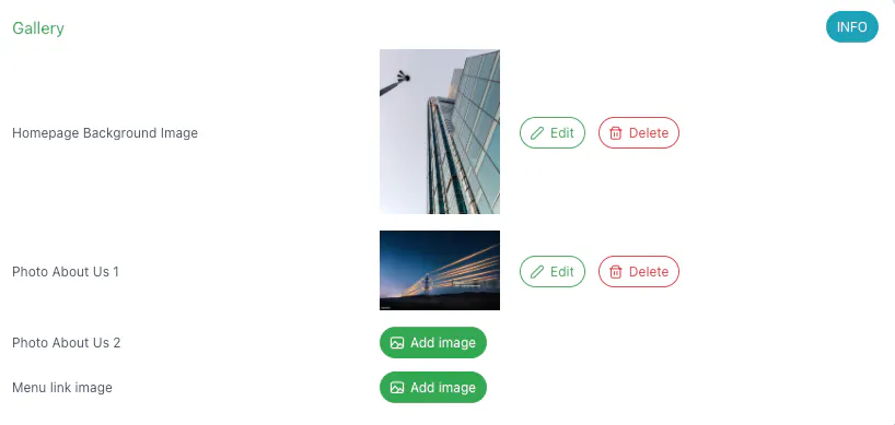 In the Gallery section, you can upload images to be displayed on your website. For example, the Homepage background image will be the first visible background image on the Home page