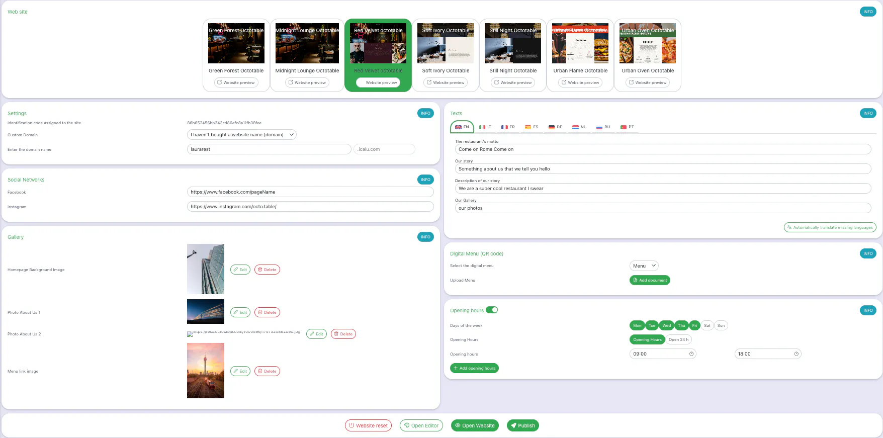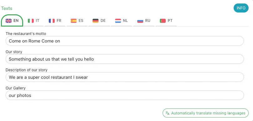 In the text section, you can add your website content. Titles are guides to what to write. For example, in the restaurant’s Motto field, you can enter your local slogan, but you are free to customize it as you like