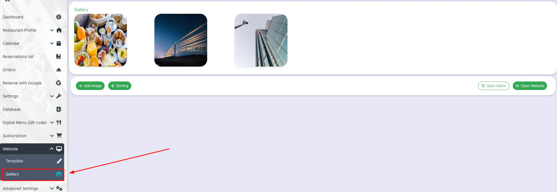 Add images to your gallery by clicking on the green + Add image button