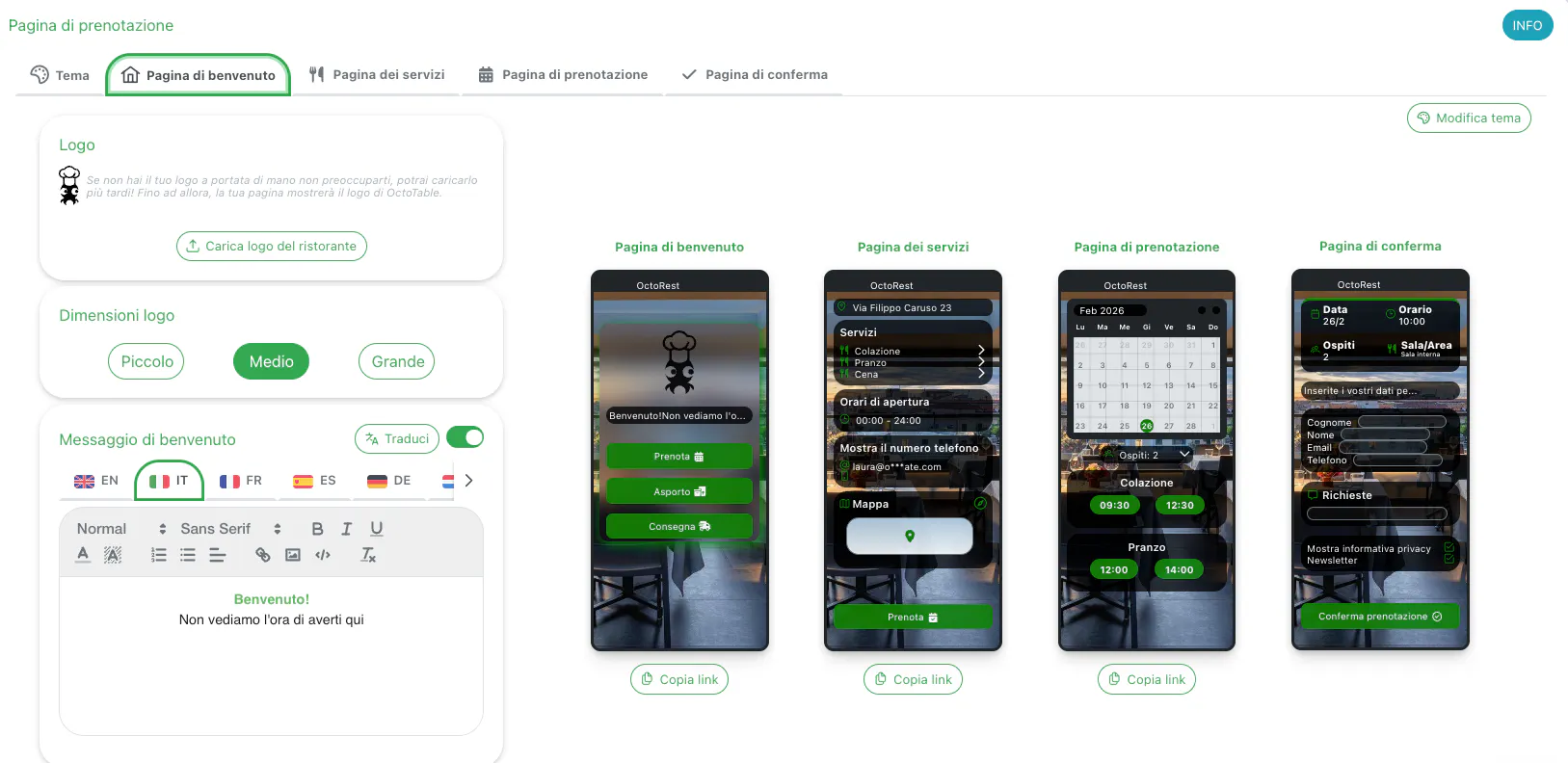Qui potrai caricare il logo del tuo ristorante e sceglierne la dimensione. Se non carichi nessun logo, sulla tua pagina di benvenuto si visualizzerà il logo octotable.