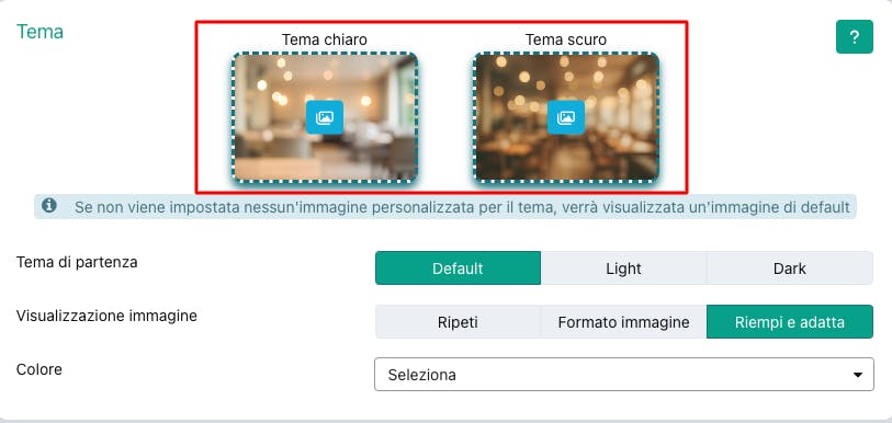 Nella sezione Tema, inserisci un’immagine per il tema chiaro (Light-mode) e/o un’immagine per il tema scuro (Dark-mode).