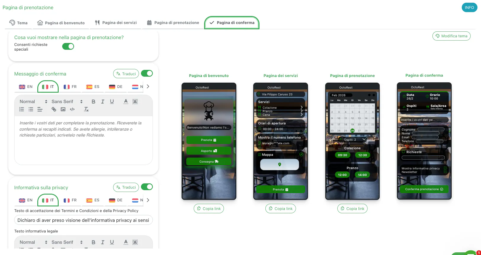 L'articolo spiega come configurare e personalizzare la pagina di prenotazione di OctoTable. Viene descritto il processo di selezione dei servizi, la gestione delle richieste speciali e l'abilitazione della visualizzazione in modalità scura o chiara, con l'opzione di caricare immagini personalizzate. Inoltre, l'articolo guida su come aggiungere il logo, personalizzare il testo per la newsletter e gestire le impostazioni di privacy e contatti.