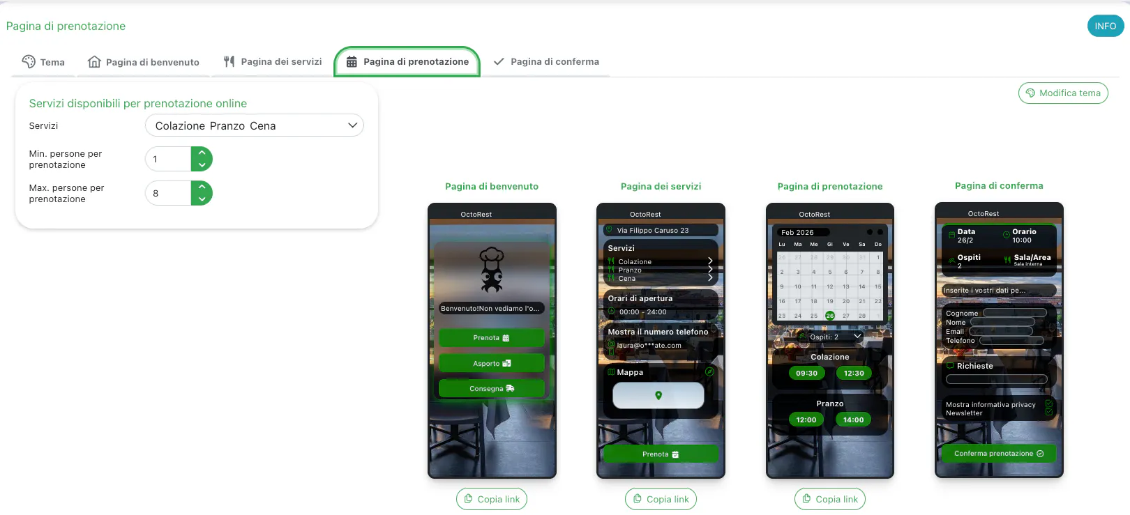 Qui, oltre a poter decidere i servizi da visualizzare sulla pagina di prenotazione, potrai impostare il numero minimo e massimo di persone per prenotazione.