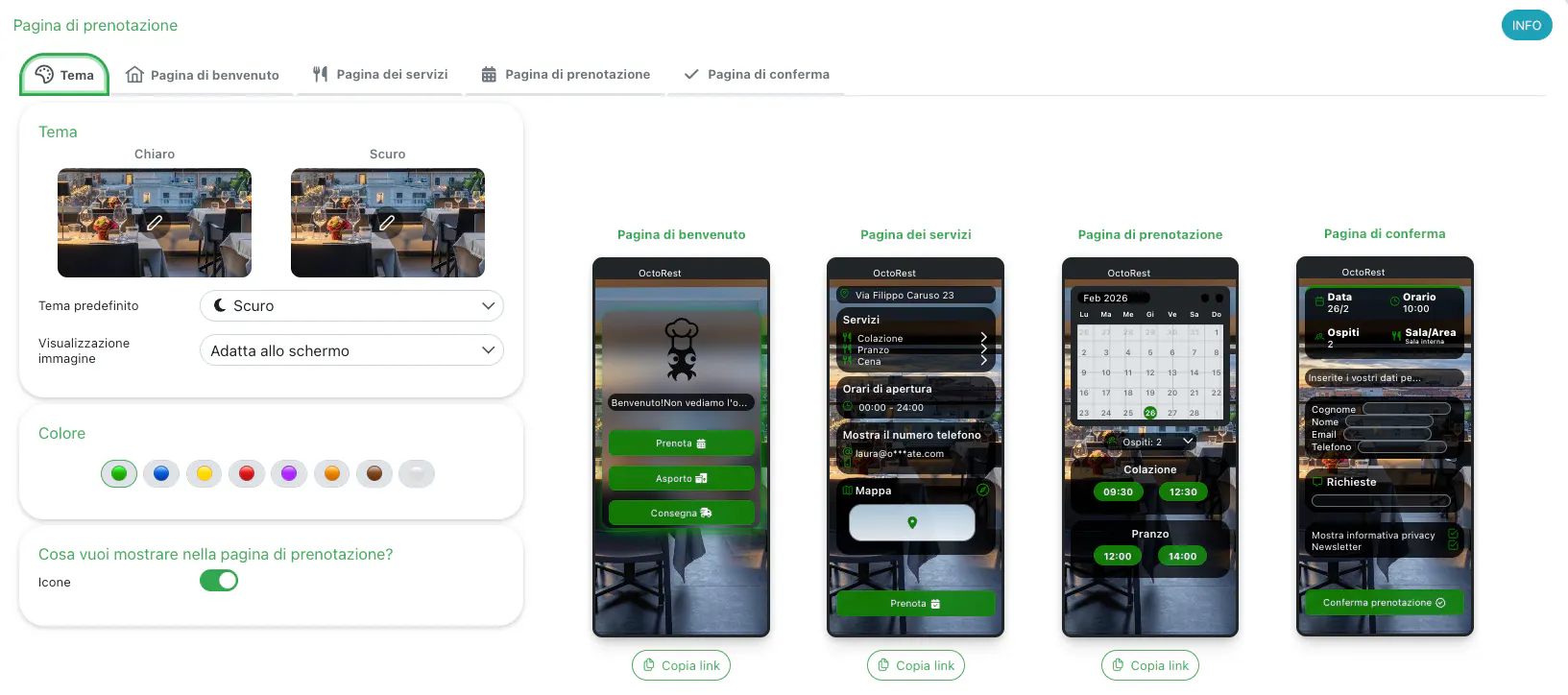 Infine, modificando il Colore, andrai a cambiare il colore degli elementi presenti nella pagina di prenotazione. Scegli dunque un colore che rispecchia il tuo brand o l'identità del tuo locale.