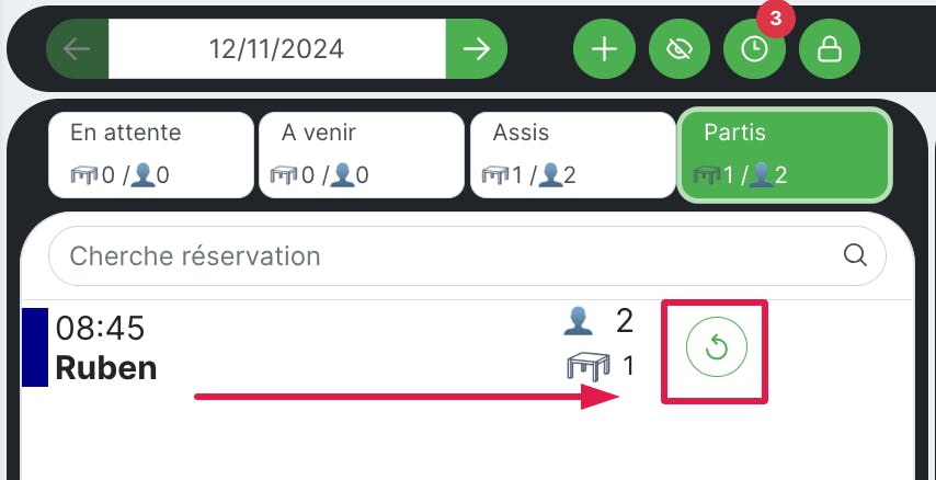 Si vous avez fait sortir un client par erreur, vous pouvez accéder au journal des «partis “ et rétablir la réservation au journal des assis 👇
