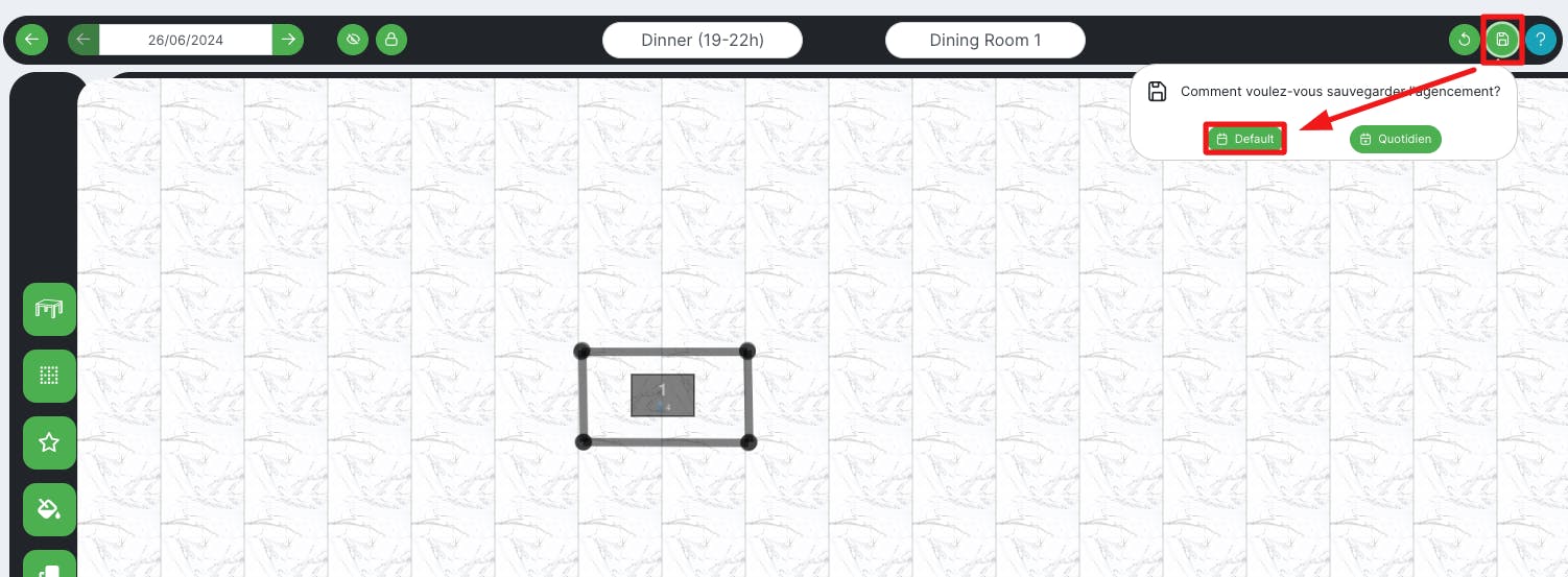Pour sauvegarder les murs et la disposition des tables, clique sur Sauvegarder (dernier bouton en haut à droite) et choisis Default.