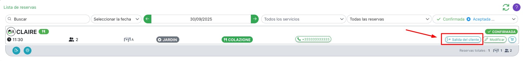 Al realizar el check-out del cliente, liberarás su mesa, que volverá a estar disponible inmediatamente para reservas online. Para hacerlo, haz clic en el icono azul visible junto a la reserva.