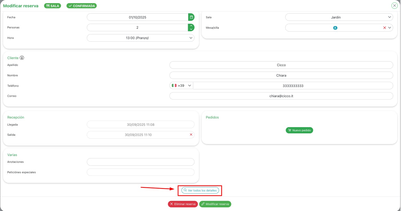 Finalmente, desde el Planning, deberás hacer clic en la reserva que visualizas en el calendario y hacer clic en "Ver todos los detalles" en la ventana Modificar reserva.