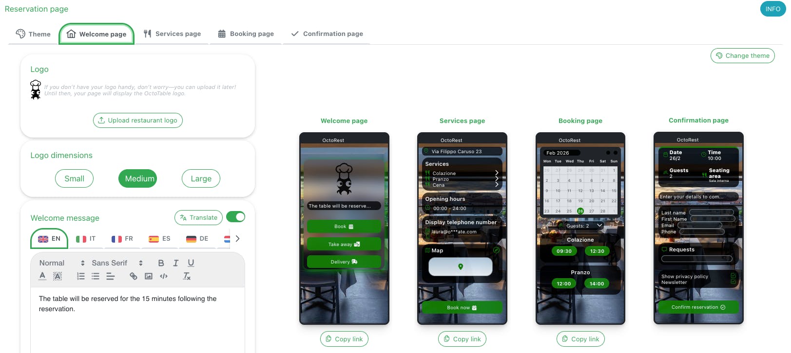 Here you can upload your restaurant logo and choose its size. If no logo is uploaded, the OctoTable logo will appear on your welcome page.