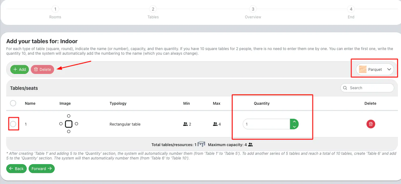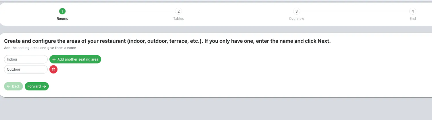 In the following page, name your restaurant’s areas. Click on Add another seating area to add more seating areas (ex. Indoor, Outdoor). If you need to delete a seating area, just click on the red bin button in correspondence of the seating area. Click on Forward to continue with the configuration of the tables within each area.