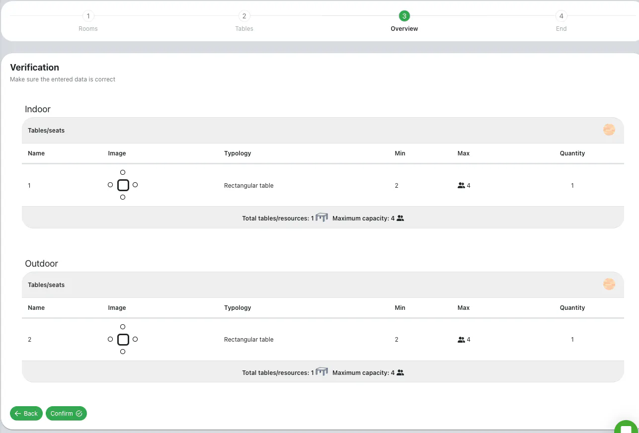 By clicking on Forward you get to the Verification page which shows a preview of all the seating areas and tables created. Click on Back to update what you have done so far and on Confirm when the configuration is correct: