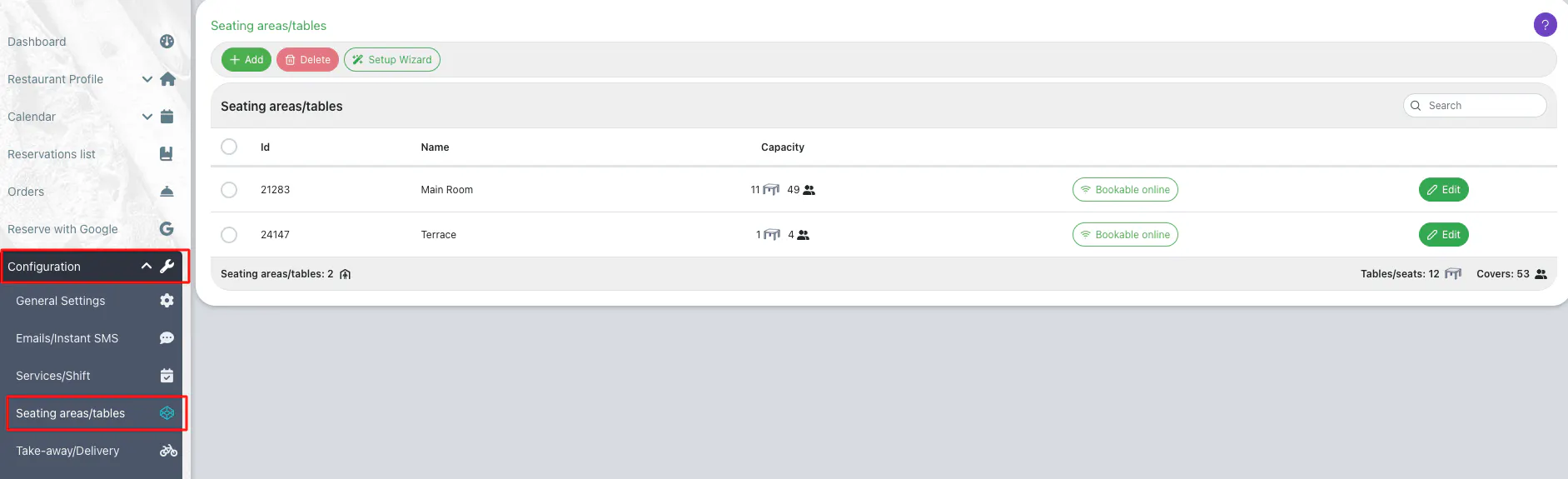 Go to Configuration > Seating areas/tables