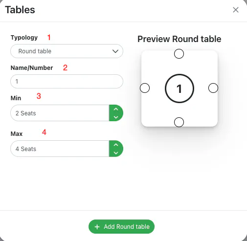 Then, click on Add round/rectangular/squared table to save the configuration of the table.