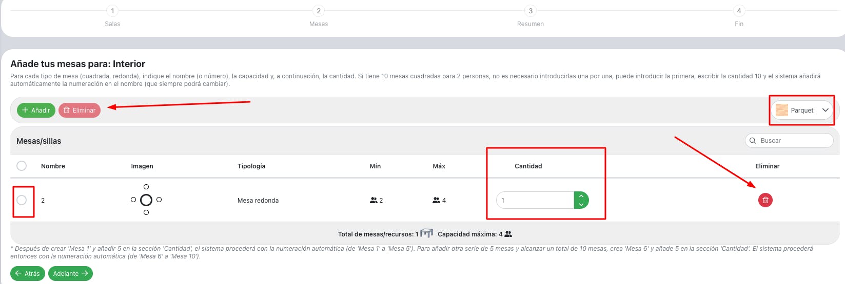 En la página siguiente, hay que nombrar las salas. Haz clic en Añadir otra sala para crear más de una sala (ej. Interior, Exterior). Si quieres cancelar una sala, hace falta darle al botón de basura rojo en correspondencia de dicha sala. Dale en Adelante para seguir con la configuración de las mesas de cada sala creada.