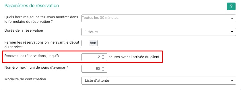 Exemple : si votre service commence à 12h00 et vous voulez recevoir les réservations au plus tard à 10h00, vous devrez insérer la valeur 2, pour dire au système que l'on peut effectuer des réservations dans les deux heures précédentes et pas au-delà.