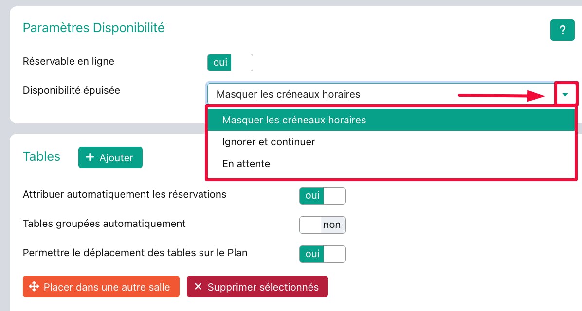 Liste d'attente pour disponibilité épuisée : vous pouvez décider d'activer la liste d'attente seulement quand la salle est au complet. Dès que vous aurez une table de nouveau libre, le client sera informé et pourra confirmer ou annuler la réservation.