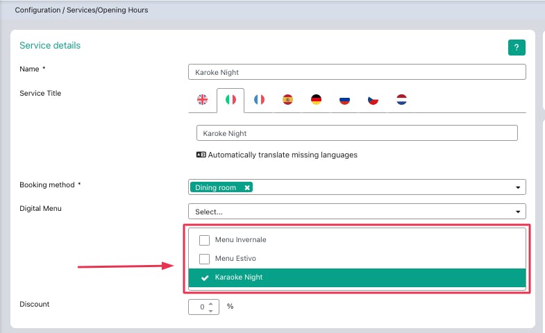 If you provide a particular type of menu for this service, you can create this specific menu and select it from the service editing page in the Digital Menu section:
