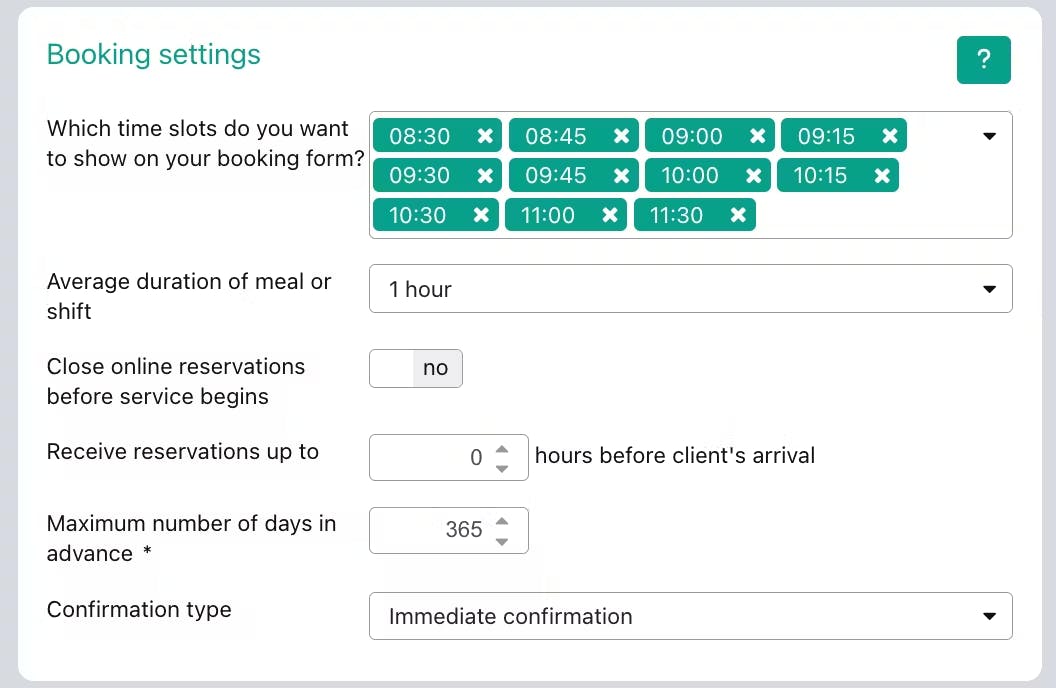 For example, if you set 2 hours before arrival, a customer booking at 18:00 will not be able to book for 19:00, but will need to book from 20:00 onwards.Indicate the maximum number of days in advance for which the end customer can make a reservation.