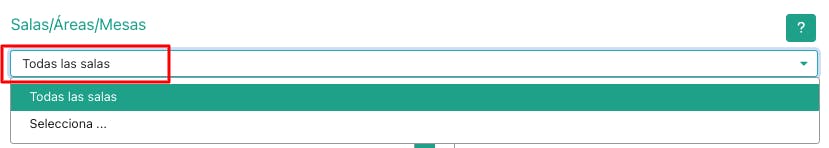 En la sección Salas/Áreas/Mesas encontrarás el menú desplegable donde seleccionar la sala asociada al servicio. Por defecto encontrarás seleccionado "todas las salas", abre el menú desplegable y marca las salas que quieres asociar.