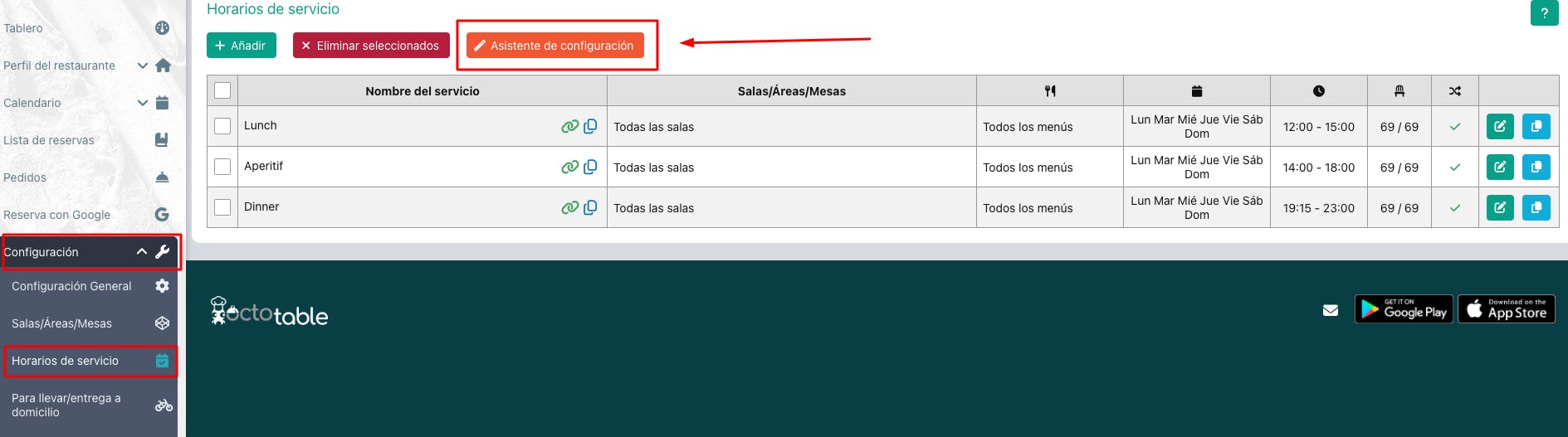 El artículo explica cómo configurar rápidamente los servicios del restaurante dentro de OctoTable utilizando el Asistente de configuración. Se describen los pasos para agregar un nuevo servicio, establecer horarios reservables, seleccionar los días disponibles y definir la duración media del turno. Además, se proporcionan instrucciones sobre cómo eliminar los servicios no necesarios.